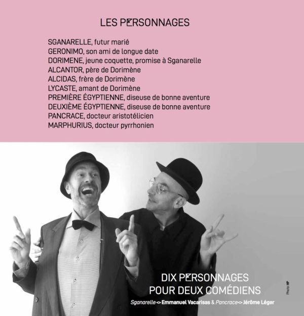 vv : « Pièce à savourer sans modération ; E. Vacarisas en truculent Sganarelle dont les certitudes vacillent petit à petit, lors de ses échanges avec son entourage ; J.Léger lui donne élégamment la réplique dans des travestissements successifs, fidèles aux personnages de Molière. M. Poquelin auraient sûrement apprécié l'esprit et la compagnie de ces 2 comédiens et vis et versa. »