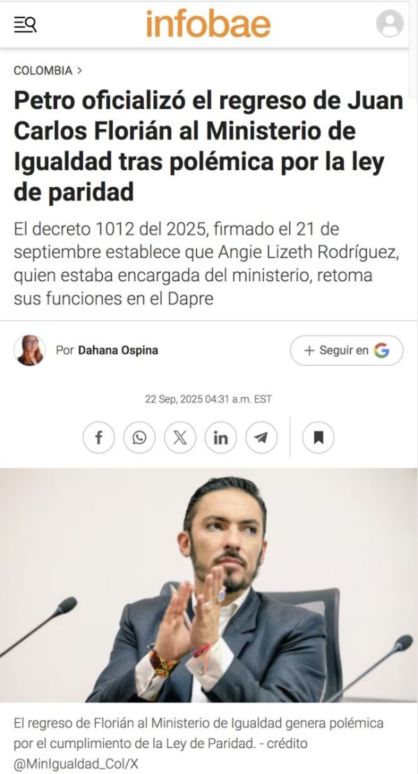 On n’avait pas prêté attention au fait que depuis fin janvier de cette année il n’était plus le ministre de l’égalité et de l’équité de Colombie. Et que depuis le 17 février 2026 il est le vice-consul de Colombie en Belgique et au Luxembourg à Bruxelles. Pourquoi ce changement de poste perçu par les commentateurs comme une rétrogradation ? Juan Florián Silva n’a pas été épargné par d’autres coups bas orchestrés par des jaloux, des ingrats et une opposition qui déteste tout ce qu'il est, tout ce que représente son ministère. Ainsi le gouvernement colombien avait été accusé de ne pas respecter la loi relative à la parité hommes-femmes. Le tribunal administratif de Cundinamarca confirmant l’infraction, Silva avait démissionné du ministère le 15 septembre 2025. Six jours plus tard, après que le pouvoir exécutif a procédé à d'autres nominations, il put réintégrer son poste.