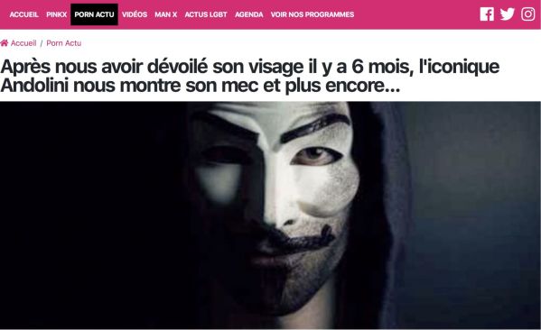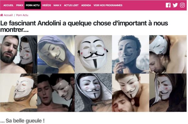 Une carrière porno est bien souvent faite de réinventions de soi-même, surtout quand elle dure sur une ou plusieurs décennies. Il n'est ainsi pas exceptionnel que des twinks passifs réapparaissent en surmâles actifs ou versa, voire ne tournant plus que pour le X hétéro. Et les années passant, certains de ces ex-twinks accèdent au statut de daddies ! Ces réinventions peuvent s’accompagner de retraites suivies de comebacks ainsi que de changements de pseudo. Dans le cas du Lyonnais Andolini, les réinventions ont été plus rapides et peut-être plus spectaculaires. Non pas qu’il ait changé de rôle sexuel, car il demeure toujours aussi strictement actif qu’à ses débuts vers 2020/21. Ce qui a changé, c’est ses façons radicales de se présenter. Au départ, Andolini était ce mec viril et TTBM anonymisé par le port du masque de Guy Fawkes, masque popularisé par le comic-book V for Vendetta sorti dans les années 1980, puis par son adaptation cinématographique en 2005 et enfin par les Anonymous qui s’en sont emparés à partir de 2008. En mai 2023, coup de théâtre, Andolini dévoile son visage. Un événement qui a suscité notre tout premier article enthousiaste sur le créateur de contenus qui tournait alors de plus en plus pour Citébeur.