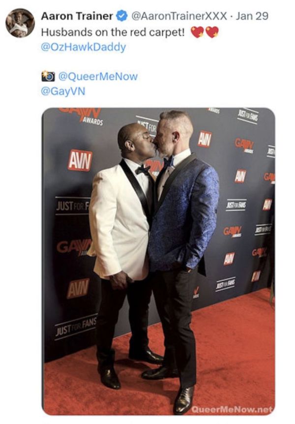 Comme nous l’avions rappelé dans notre article consacré aux GayVN Awards 2026, ce type d’évènements prestigieux est l’occasion pour des porn stars de s'afficher avec leur cher et tendre. Travailler dans le porno est en effet parfaitement compatible avec une vie amoureuse épanouie. Aux couples que nous avions évoqués, il nous faut ajouter celui que forme Aaron Trainer et Oz. Il y a quelques jours, L’Américain a posté ceci sur X…