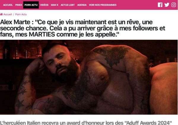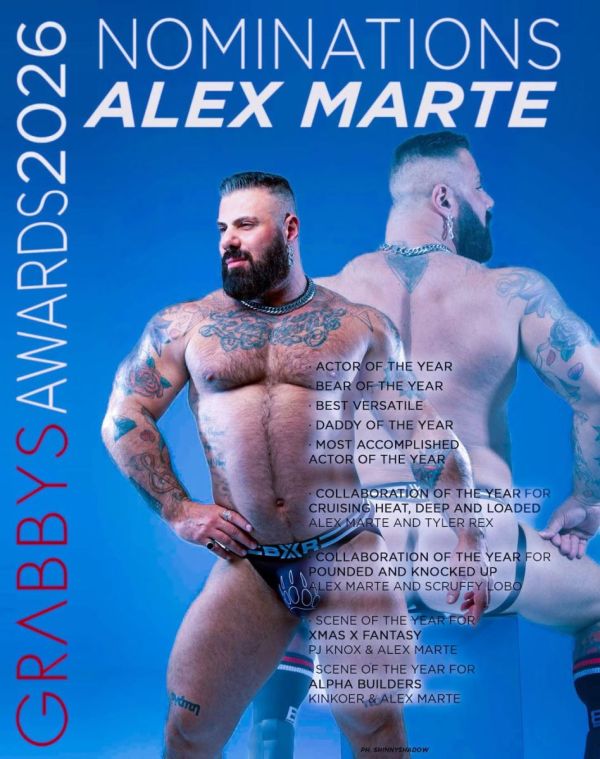 Parallèlement à ce retour au sein de MenAtPlay qui en avait fait une super star du X gay dans les années 2010, Alex Marte - qui est principalement créateur de contenus depuis son comeback porno en 2023 -, est multi-nommé aux GRABBYS Europe 2026 :