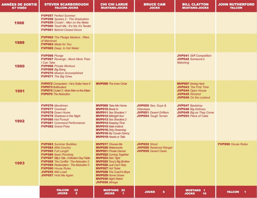 Au vu des éléments disponibles sur GayEroticVideoIndex, voici la répartition - en fonction des réalisateurs - des films sortis entre 1988 et 1993 chez FALCON (FVP), MUSTANG (MVP) et JOCKS (JVP).
