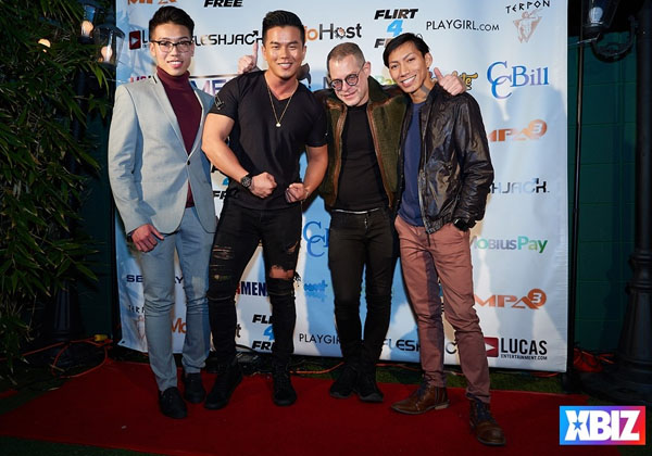 Danny Z Zeeman entouré des acteurs Dylan Art Nguyen, Alex Chu et David Ace en janvier dernier, lors des Cybersocket Awards 2018. PeterFever a été honoré du prix du meilleur site à thématique asiatique ! - Photo : Xbiz