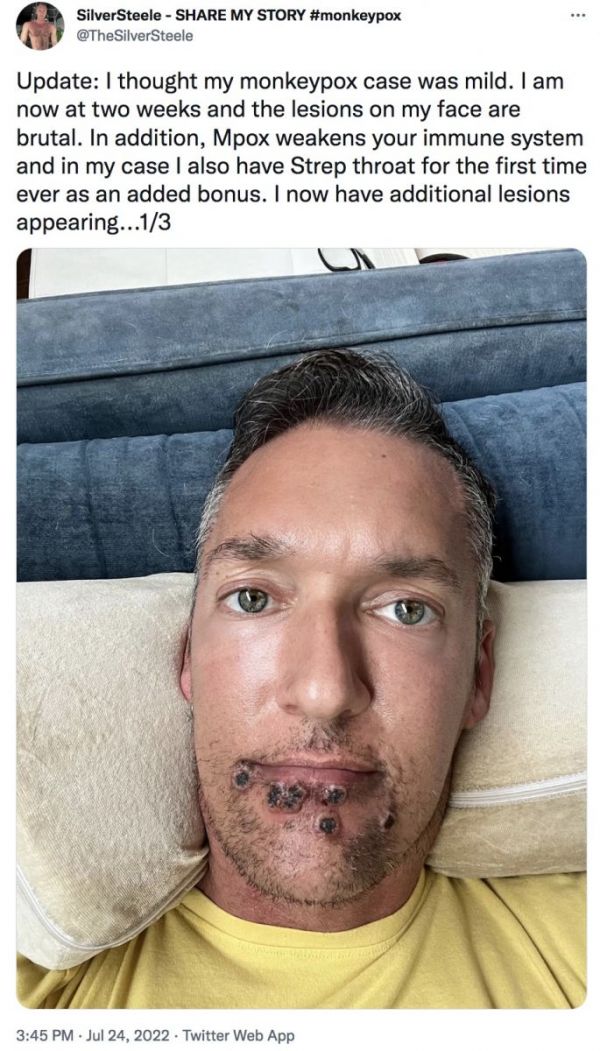 Alors que le 23 juillet 2022 l’OMS a déclaré une urgence de santé publique de portée internationale concernant la variole du singe, plusieurs porn stars gays nord-américaines témoignent en être malade. Notamment l’exclusif de Falcon, Luca del Rey, le Canadien Quin Quire et Adama DeLuca. Avant le 23 juillet, le Texan Silver Steele avait aussi tweeté sur sa maladie, en donnant toutefois plus de détails cliniques :