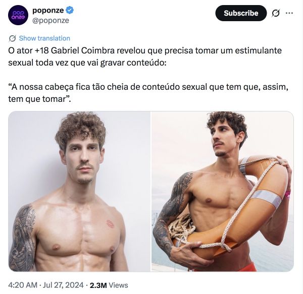 Créateur de contenus depuis 2020, le Brésilien Gabriel Coimbra a acquis une notoriété - et une influence - plus grande encore depuis qu’il tourne à Rio de Janeiro avec le multiawardisé Américain Rhyheim Shabazz ; au sein de ses productions et coproductions avec NakedSword…